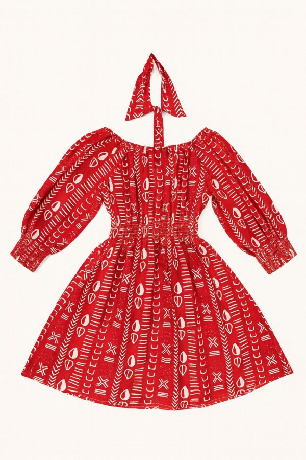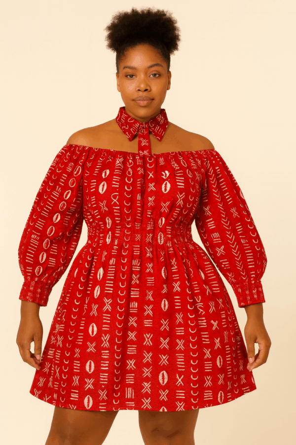 The Ruby Tribal Muse Ankara Dress features a rich, vibrant red wax print accented with traditional tribal-inspired symbols. The smocked waist shapes your silhouette effortlessly, while the matching collar tie adds that signature statement twist.