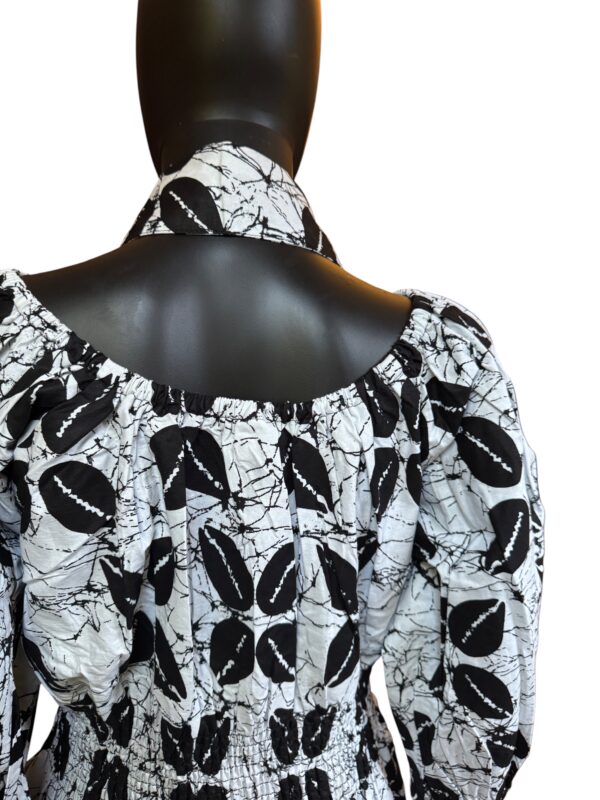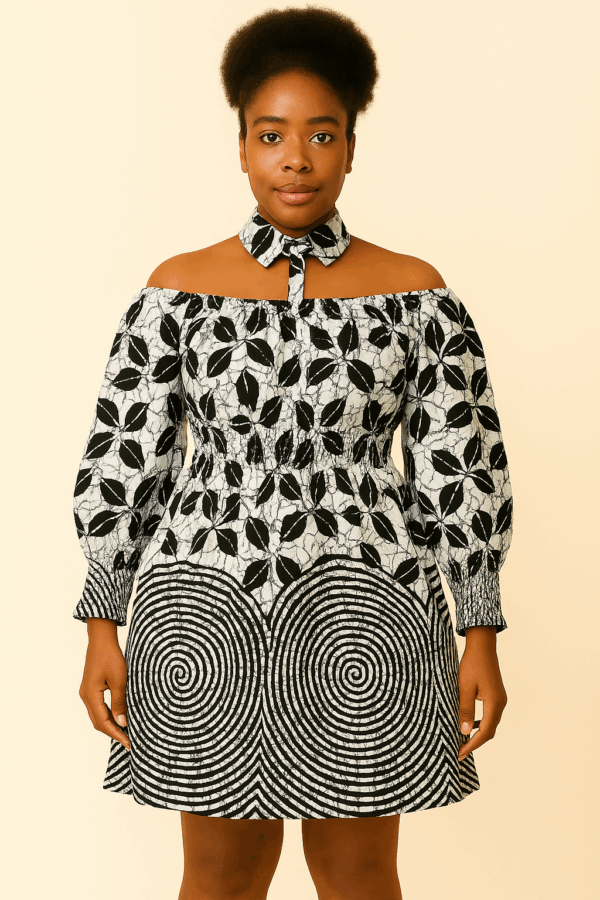 This Black & White Galaxy Ankara Dress blends cultural charm with modern elegance, featuring a striking leaf-print bodice that flows into a hypnotic swirl-pattern skirt. The perfect mix of contrast and movement.
