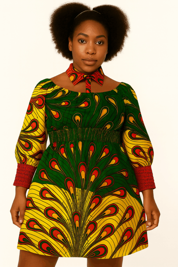 Crafted with rich green, yellow, and red Ankara patterns, this dress showcases a stunning peacock-inspired print that radiates culture, confidence, and pure beauty.