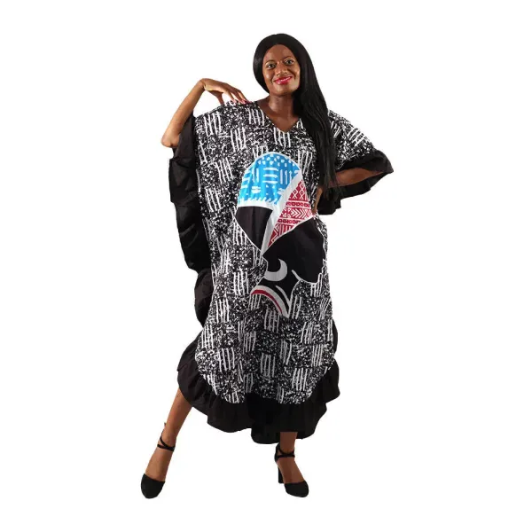 Soft black ruffles flow from sleeve to hem, giving every step a touch of drama and elegance. Made from 100% breathable cotton, this kaftan offers comfort, beauty, and cultural pride in one timeless piece.