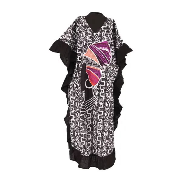 Crafted from 100% breathable cotton, it drapes beautifully with a flowing fit, flattering V-neckline, and soft black ruffle trim that adds movement and elegance. Perfect for relaxing at home, attending cultural gatherings, or simply embracing your heritage in style.