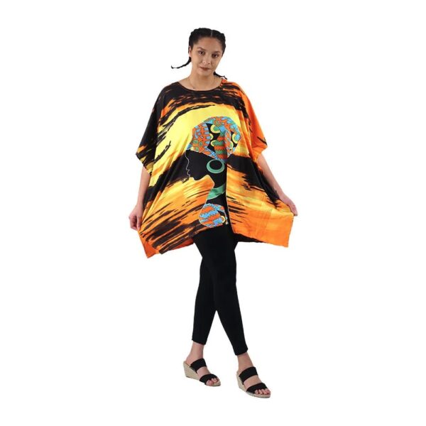 Light up any room in the Nubian Glow Short Kaftan, a radiant tribute to African elegance and identity. This bold orange and black kaftan features a silhouette of a Nubian woman crowned with a vibrant patterned headwrap in blue, green, and orange tones—capturing the essence of culture and beauty.
