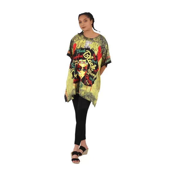 Celebrate your radiance in this bold kaftan-style top featuring a regal African queen surrounded by affirmations like Proud, Black, Empowered, and Strong. Designed in golden yellow with red and black accents, it’s a flowy, easy-fit top that makes a powerful statement — without saying a word.