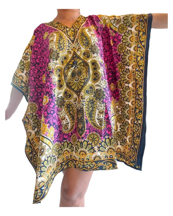 Striking paisley and floral dashiki print in fuchsia, gold, black, and ivory