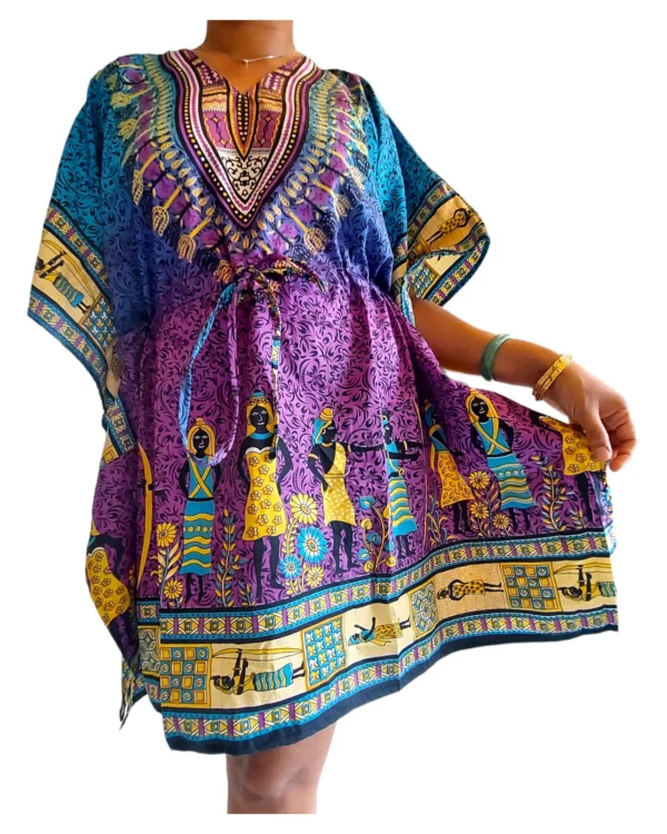Bold and breathtaking, the Crown & Kin kaftan honors sisterhood, legacy, and divine femininity. With cascading hues of turquoise, indigo, and purple, it’s a visual celebration of African artistry and communal strength. From the regal neckline to the radiant village queens along the hem, this piece carries culture in every thread.