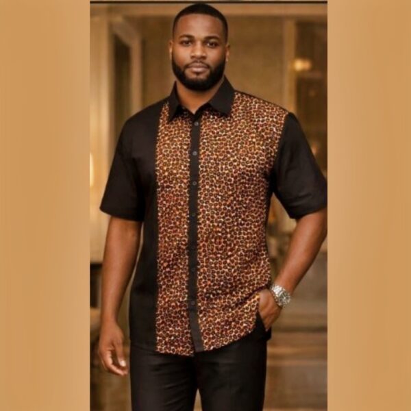 The warm earth-tone mosaic pattern contrasts beautifully with the sleek black cotton base, creating a refined look that balances cultural heritage with contemporary style. Lightweight and breathable, this shirt offers comfort while maintaining a sharp and polished appearance.