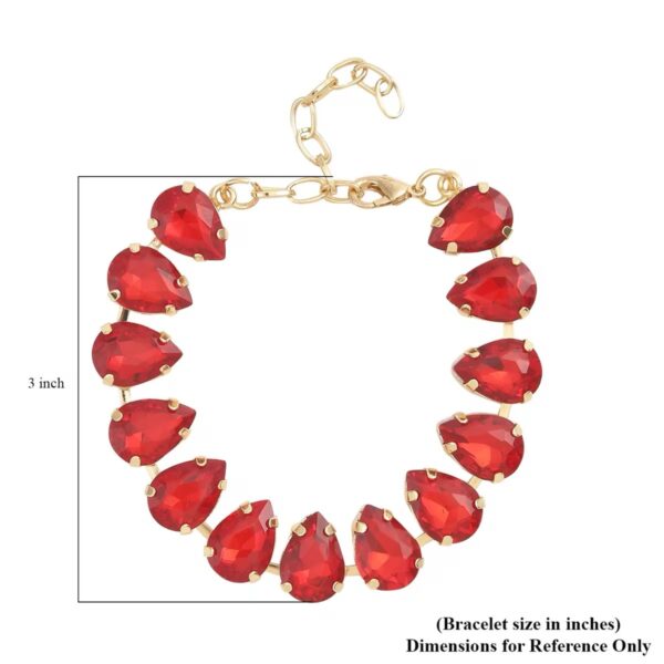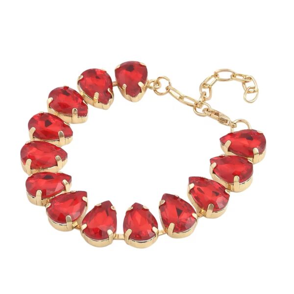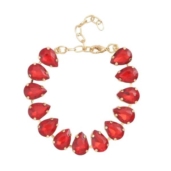 This Crimson Teardrop Tennis Bracelet features 13 pear-cut simulated ruby glass stones, each prong-set in polished goldtone brass for maximum sparkle and structure. The evenly spaced teardrop design creates a refined yet eye-catching silhouette that elevates both casual and evening looks.