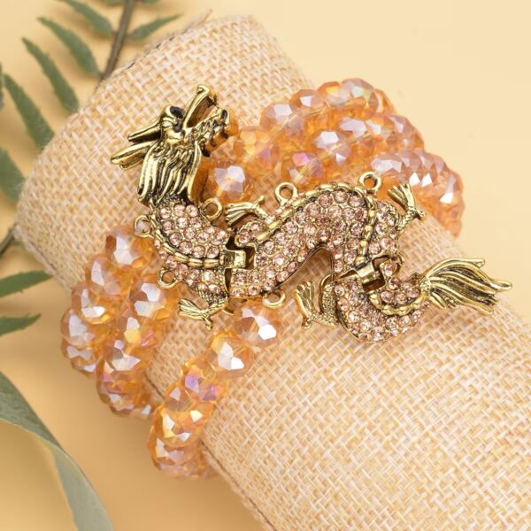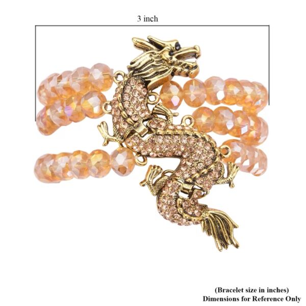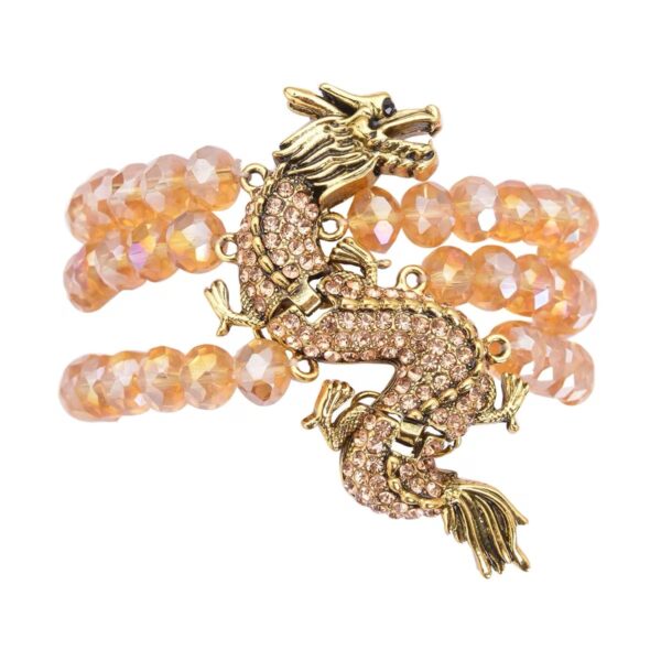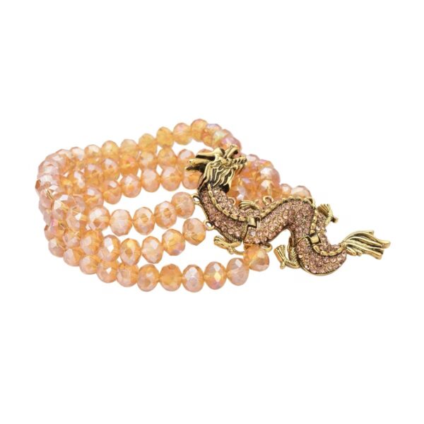 The Champagne Crystal Dragon Bracelet features a dramatic sculpted dragon centerpiece set across three strands of faceted champagne glass beads. Accented with shimmering Austrian crystals, this layered statement piece blends bold symbolism with luminous elegance.