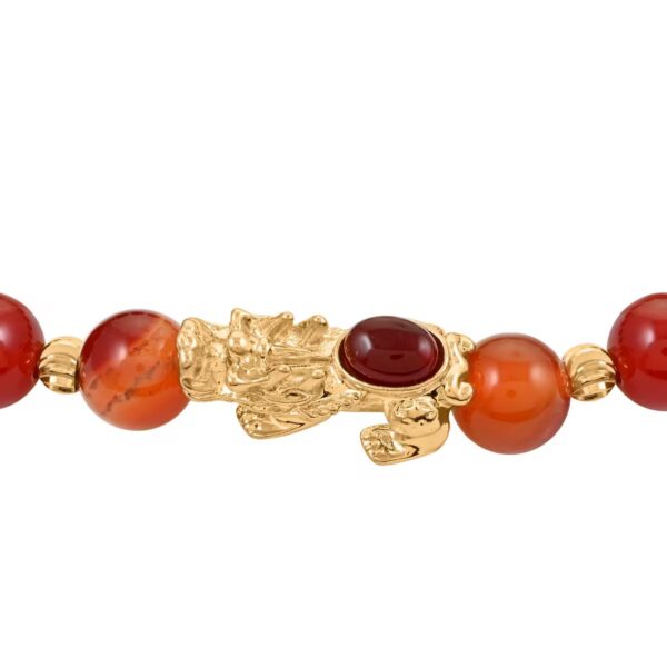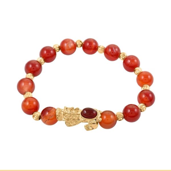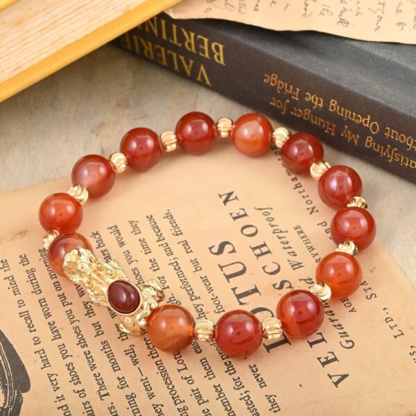 Red agate is traditionally associated with grounding energy, courage, and emotional stability, while the Pixiu symbol represents wealth and protection in Feng Shui practice.