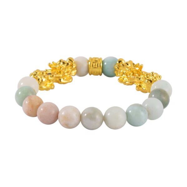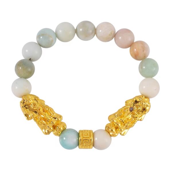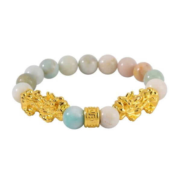 Amazonite is known for promoting harmony and clarity, while the Pixiu charm represents wealth, protection, and good fortune.