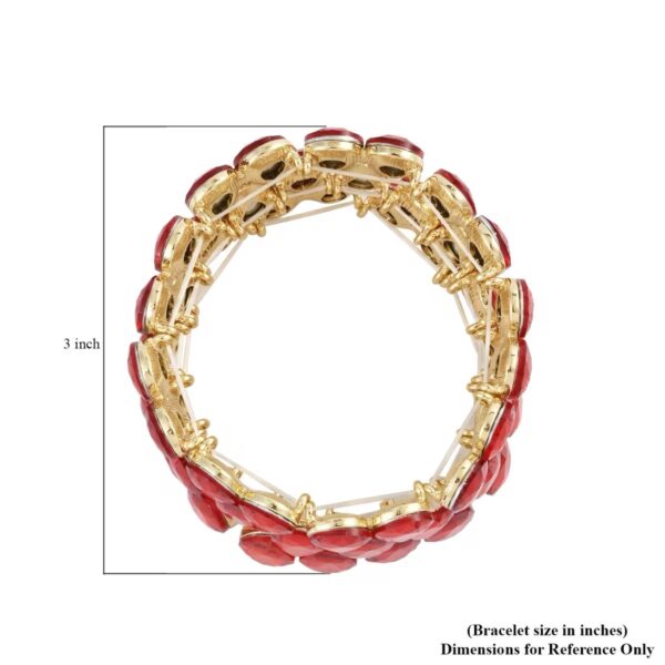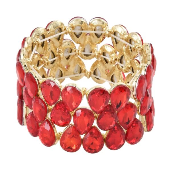 Turn heads with the bold elegance of the Ruby Glow Stretch Cuff Bracelet. Designed with 65 pear-cut red glass stones arranged across three radiant rows, this wide stretch bracelet delivers dramatic sparkle with comfortable wearability.