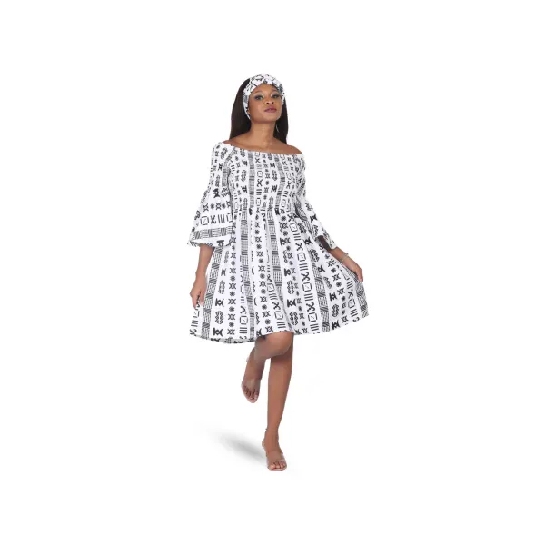 With a flattering off-shoulder neckline, 3/4 bell sleeves, and a cinched waistline, this midi-length dress moves with effortless grace. Whether worn to a celebration or styled casually, it’s a powerful reminder that culture is always in fashion.