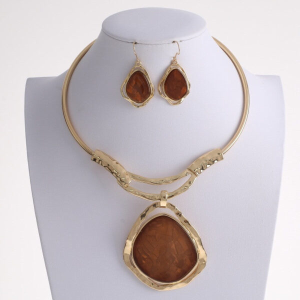 Bring warmth and structure to your look with this Golden Earth Tone Statement Choker Set. Featuring a bold sculpted brown center framed in textured goldtone metal, this architectural design delivers modern elegance with earthy character.