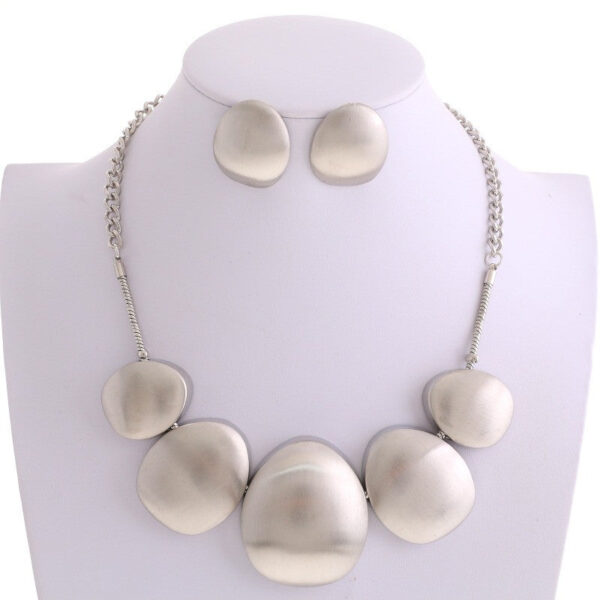 Elevate your look with this sculpted silver pebble necklace and matching earring set. Designed with smooth, organic-shaped silver discs and a soft matte finish, this modern 2-piece set delivers clean, contemporary style with effortless polish.