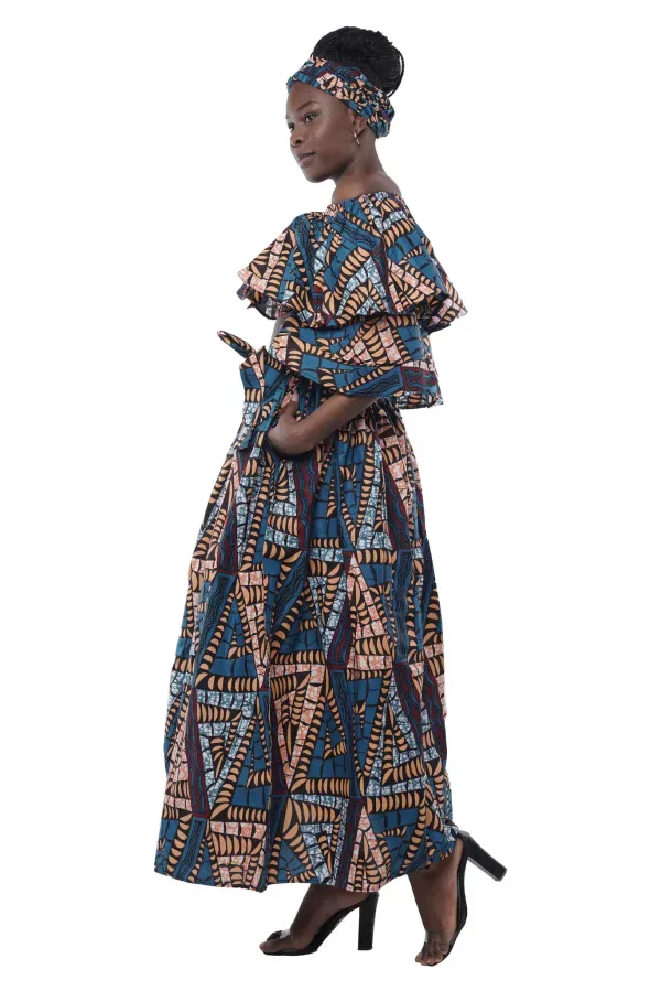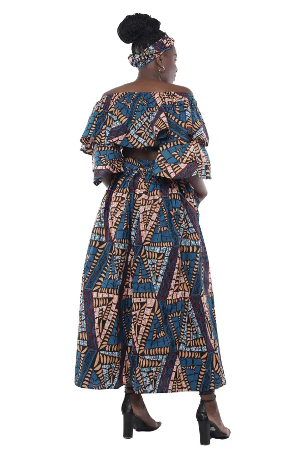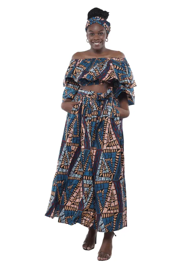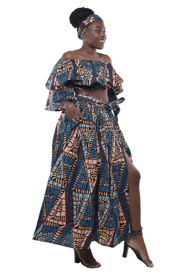Crafted from 100% cotton wax print, this breathable outfit features a rich blue base with tribal-inspired geometric patterns in warm tan and maroon. The off-shoulder crop top has soft ruffle sleeves for a flattering silhouette, while the maxi skirt includes a thigh-high slit for ease of movement and style. The elastic waistband with self-tie belts ensures a comfortable, adjustable fit. Two side pockets add everyday convenience.