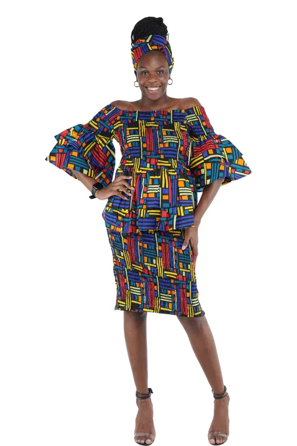 The off-shoulder blouse is designed with a flared peplum hem that adds movement and shape at the waist, paired with tiered ruffle sleeves for added drama. The knee-length pencil skirt has an elastic waistband with attached self-tie belts for a flattering, comfortable fit. A matching headwrap completes the look with effortless versatility.