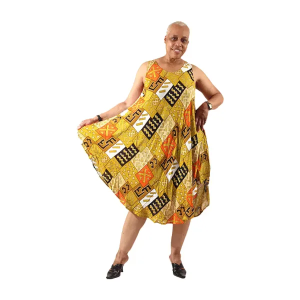 Add a bold and breezy touch to your wardrobe with the Tribal Patchwork Parachute Dress. Designed with vibrant earth-toned blocks and African-inspired symbols, this sleeveless dress features a relaxed, flowy silhouette that flatters every figure.