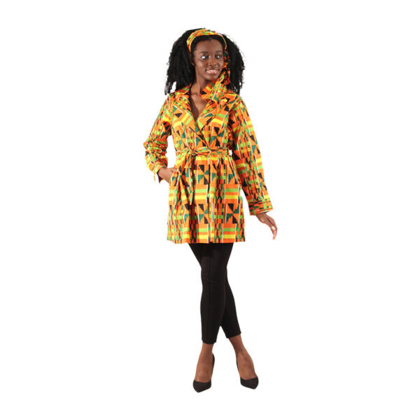 Free Size – Â Bright and bold, this Lightweight Wrap Blazer is perfect for making a distinctive African fashion statement. It has a wrap style with button cuffs, on seam pockets, and a detachable belt with loops.This blazer can be worn by itself for mild fall weather or layered onto other tops for protection against chilly winter weather. This blazer ends a few inches below the hips, making it long enough to protect your entire torso. A belt around the waist adds an extra fashionable touch. Spice up your wardrobe with this African print lightweight wrap blazer. On seam pockets.