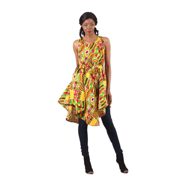 Step out in confident color with the Kente Flair Asymmetrical Dress. Designed with a bold kente-inspired print, this sleeveless dress features a flattering scoop neckline, flowing high-low hem, and a tie-waist detail that lets you shape your silhouette your way. The asymmetrical cut adds modern flair to a traditional look.