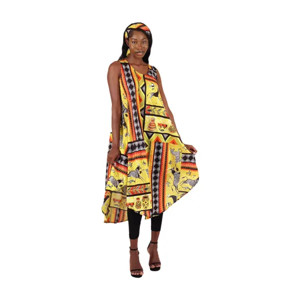 Stylish and bold, this Tribal Print Umbrella Dress is an authentically African addition to your warm-weather wardrobe. It features a sleeveless design with a flattering U-neckline, wide shoulder straps, and an easy, flowing bodice that cascades into a handkerchief-style hemline.