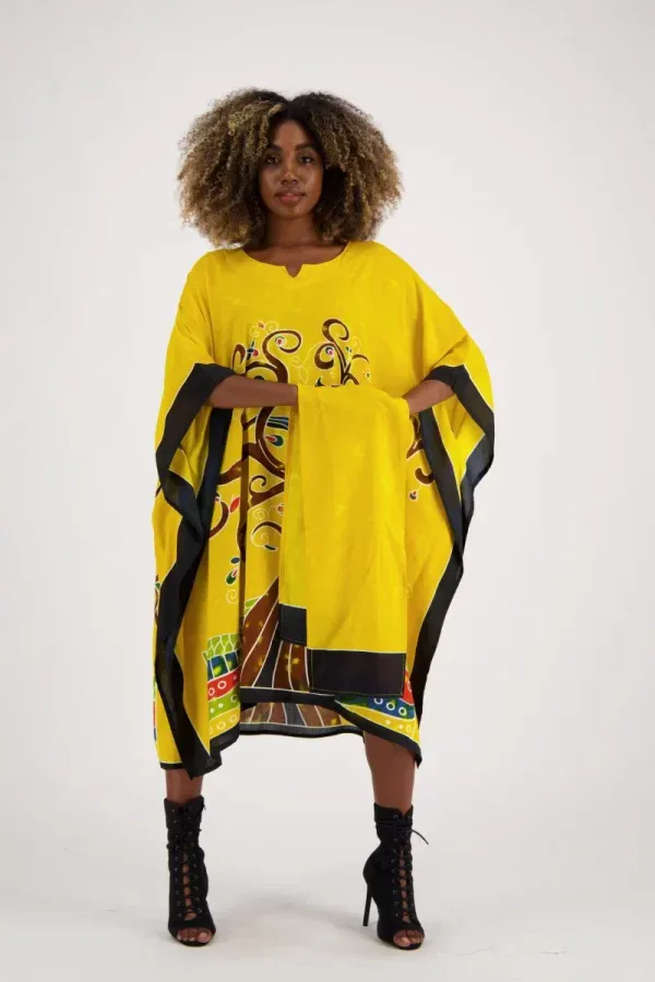 Step into radiant beauty with the Sunrise Bloom Hand-Painted Kaftan Set, a bold expression of culture and comfort. Crafted from lightweight 100% rayon, this vibrant yellow kaftan features a hand-painted tree of life design with swirling branches and colorful accents, framed by elegant black trim for a striking contrast.