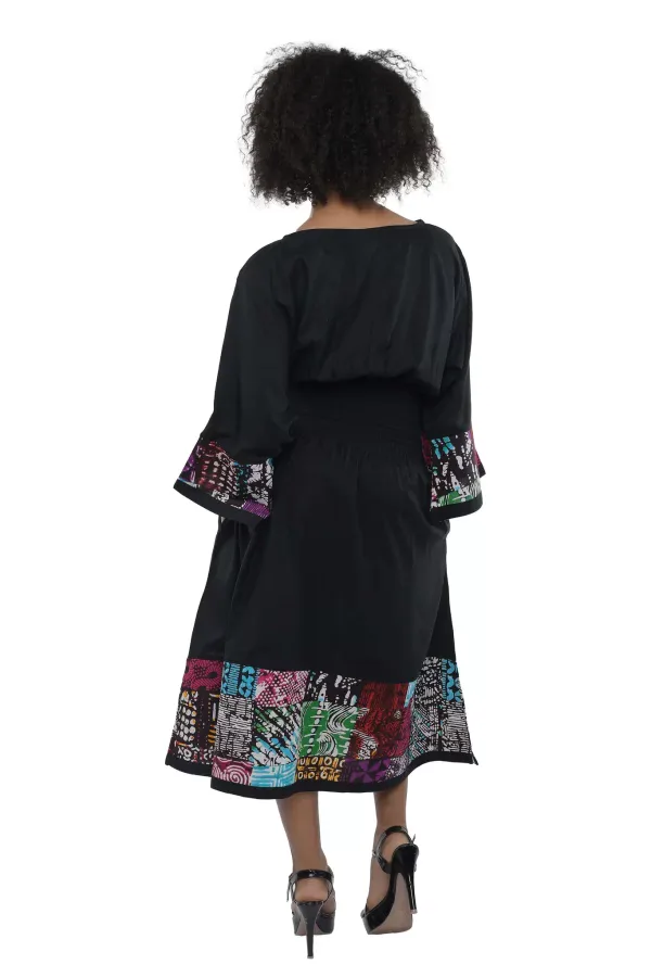Step out in confidence with our Noir Mosaic African Trim Midi Dress, a bold blend of timeless black elegance and vibrant cultural flair. Made for style and ease, this midi-length dress features colorful patchwork-style Ankara print trim along the sleeves and hem, creating a striking contrast that catches the eye.