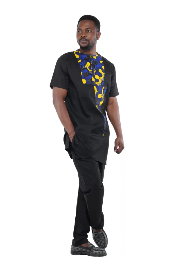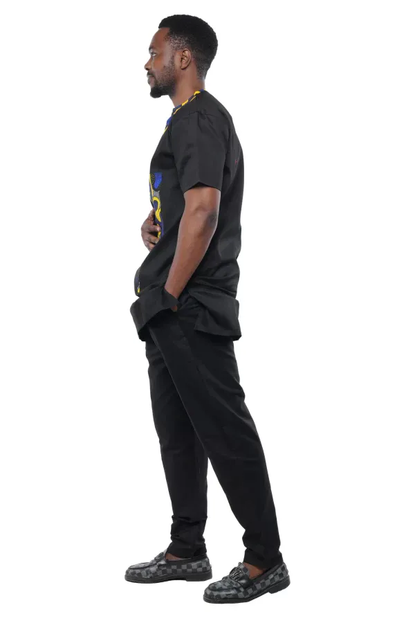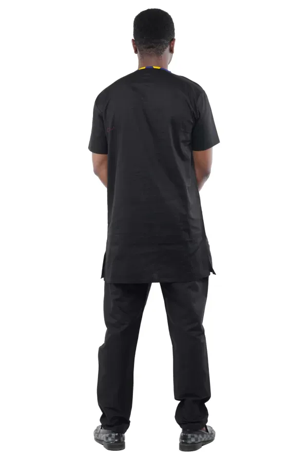 Make a bold statement with this men’s black two-piece pant set with contrast trim. This short sleeve outfit combines clean structure with standout detail.