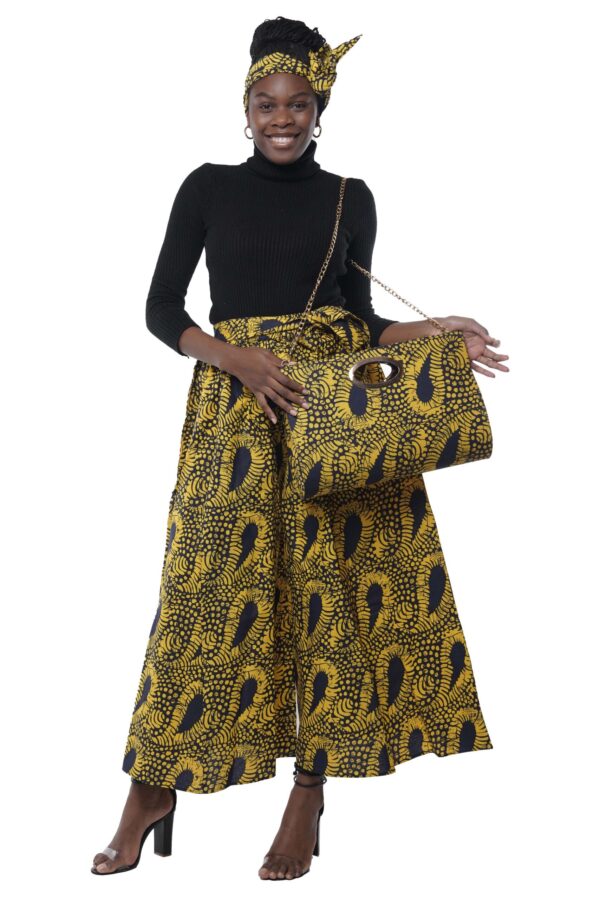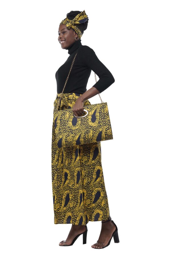 This coordinated ensemble includes roomy palazzo pants with an elastic waistband (28″–56″), a matching structured handbag with a gold chain strap, and a headwrap for polished styling from head to toe.