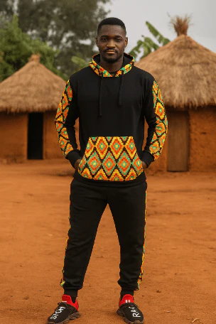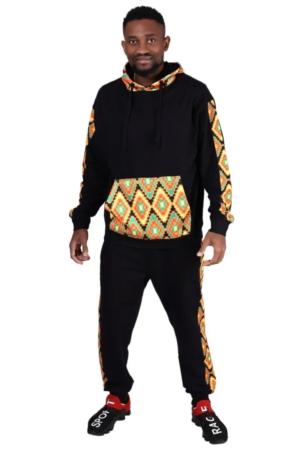 Turn heads in this black African print hoodie and jogger set featuring vibrant orange, teal, and golden geometric accents. This coordinated sweatsuit blends cultural expression with modern streetwear comfort.