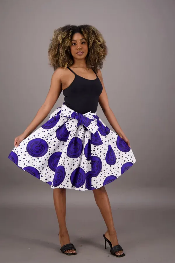 This elegant wax print skirt blends bold design with everyday practicality. Crafted from 100% authentic cotton, it features a clean white base with striking blue swirl patterns and scattered black accents, creating a modern yet culturally inspired look.