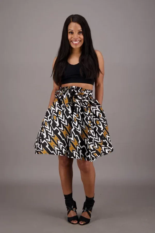 Make a powerful statement with this bold wax print skirt featuring a dynamic geometric design. Crafted from 100% authentic wax print cotton, it offers a breathable, structured feel with long-lasting comfort. The print combines mustard yellow, deep black, and crisp white in a mix of zigzags, chevrons, and angular shapes for a modern yet timeless aesthetic.