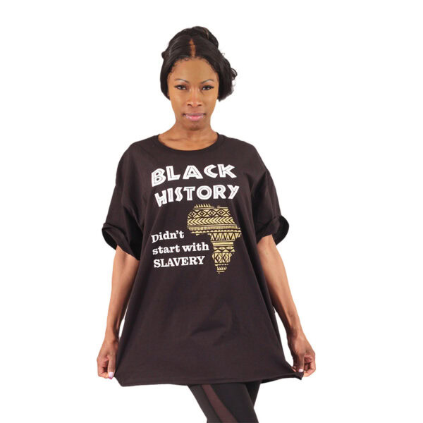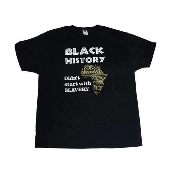 Proclaim the truth of black history with this Didn’t Start With Slavery T-Shirt. Those stolen into slavery were people with lives and families. Though some schools focus solely on slavery, black history extends back far further. From the emergence of human life to the development of agriculture; from the ancient kingdoms of Egypt and Kush to the later kingdoms of Ghana, Mali, and more; from the “Scramble for Africa” to the subsequent years of decolonization; African history is multi-layered and extensive. Whether you take this shirt as a reminder to study black history on your own, or you just want to proclaim the truth to the world, this shirt serves the message that black history isn’t limited to one period of time.