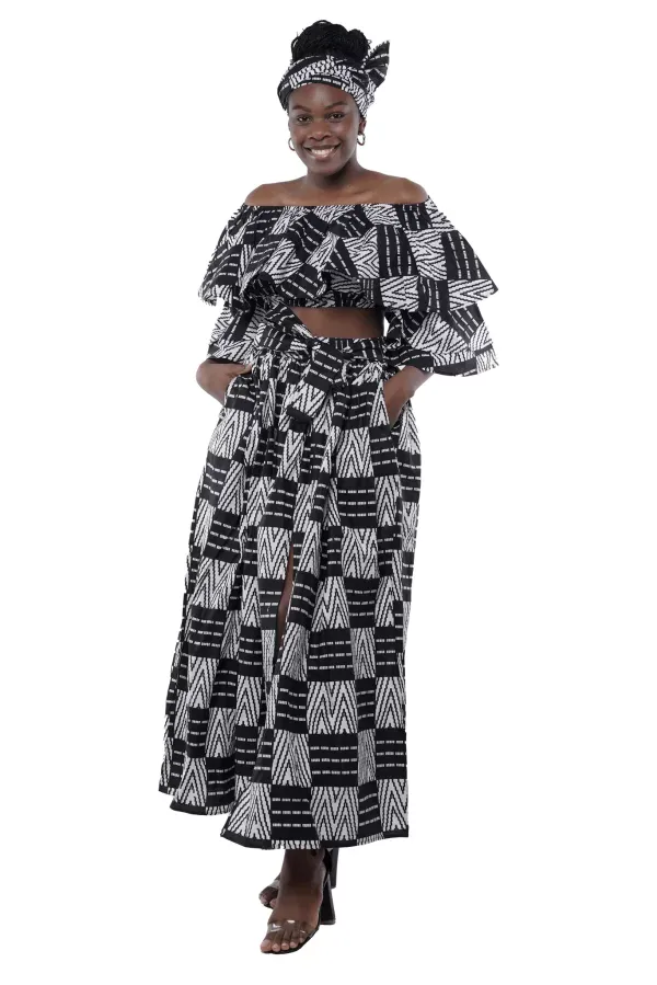 Make a bold statement in this African Skirt Set, featuring a black and white mud cloth print. Designed to fit women size XL to 3XL, this 3-piece set includes a flattering off-shoulder crop top, a high-slit maxi skirt, and a matching headwrap.