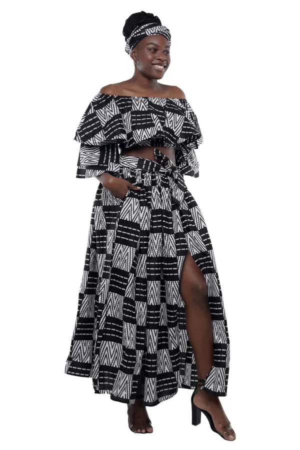 0048 – Black & White African Crop Top w Slit Skirt Set