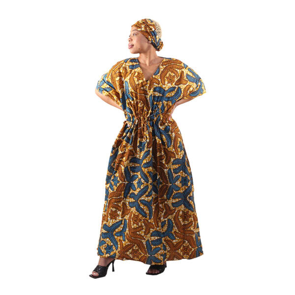 Wrap yourself in earthy elegance with the Golden Earth Drawstring Kaftan Set. Featuring rich tones of golden brown, navy, and cream in a captivating African wax print, this kaftan is a tribute to grounded beauty and cultural charm.