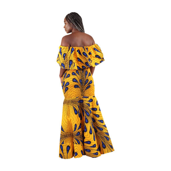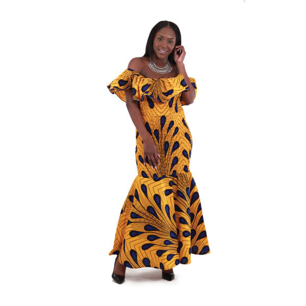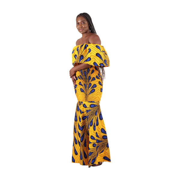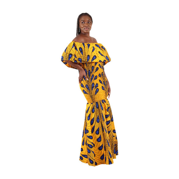This stunning African print gown features a bold and vibrant design in deep royal blue, golden yellow, and black. The fabric showcases a striking feather-like pattern that creates a flowing, eye-catching look from top to hem.