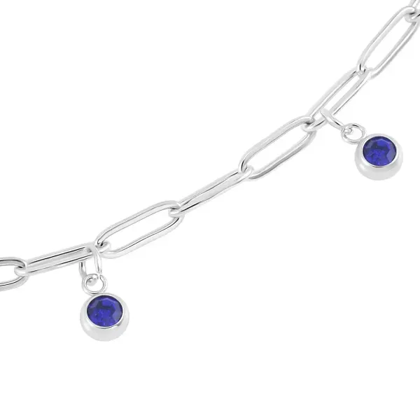 This blue crystal paperclip chain necklace features delicate Austrian crystal stations set along a sleek stainless steel chain. The elongated paperclip links create a contemporary look, while the subtle blue accents add refined sparkle.