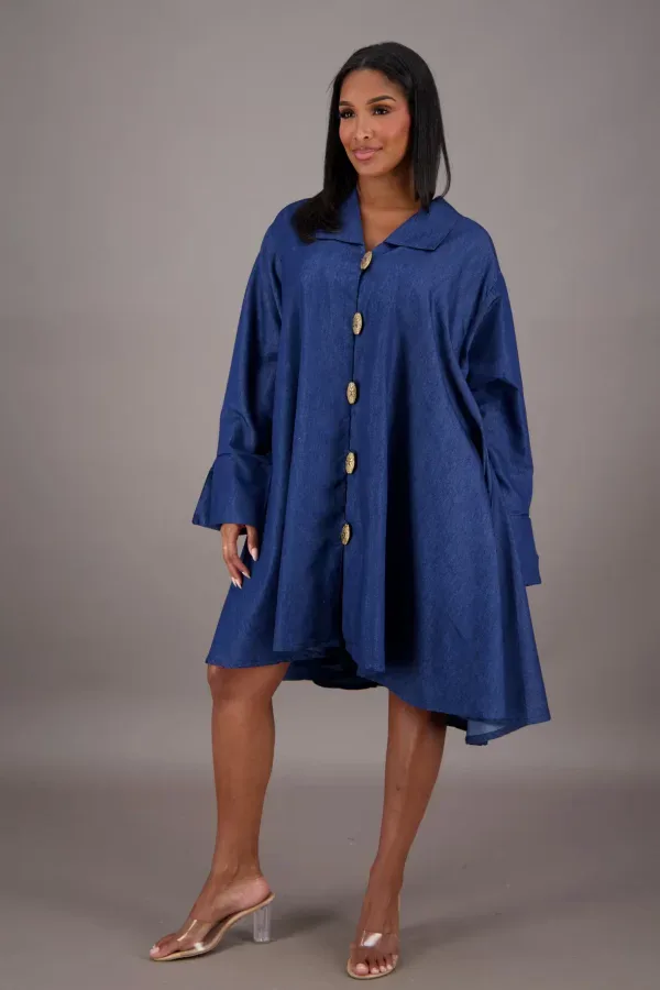 The long sleeves add a touch of elegance, while the bold, gold-tone statement buttons bring a chic, polished finish. Whether you’re headed to brunch, work, or an evening out, this versatile denim dress is your new wardrobe go-to for casual sophistication.