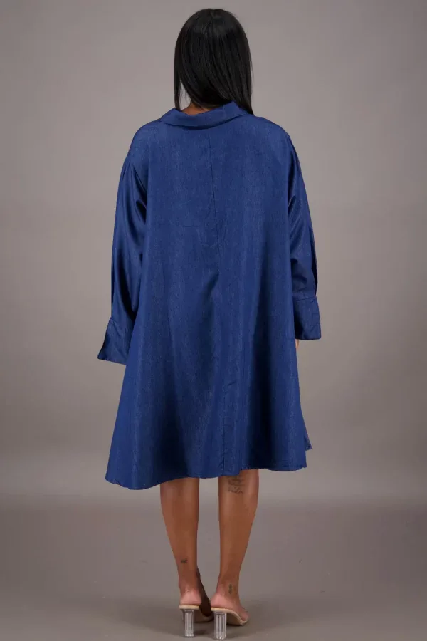 Classic Blue Denim Swing Dress – Long Sleeve with Statement Buttons (100% Cotton). Fits Sizes 1XL – 2XL