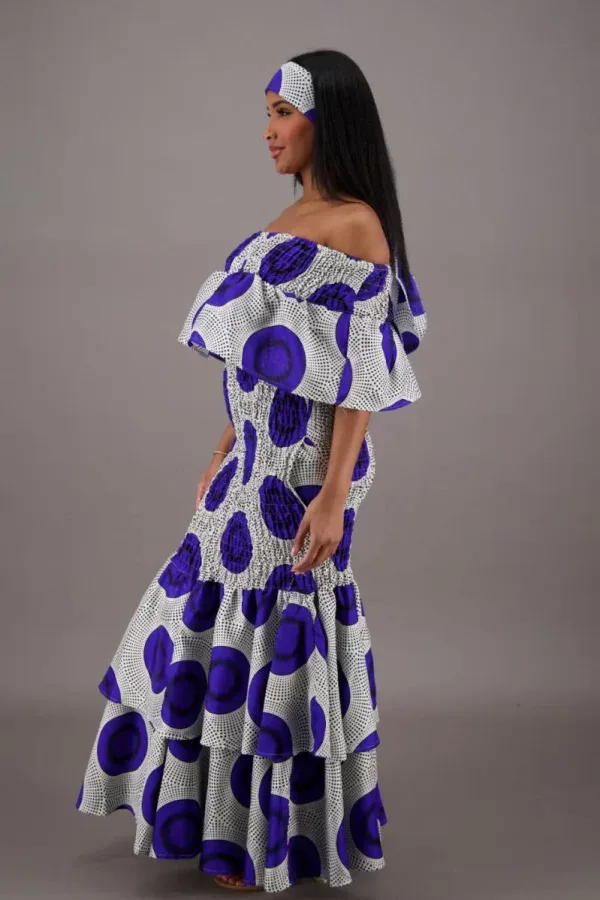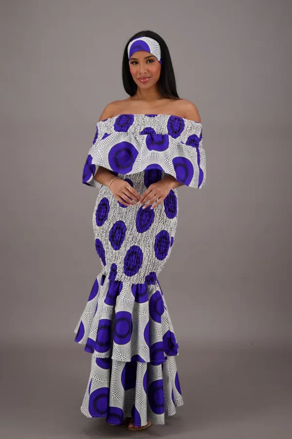 Make a statement with our Indigo Moon Off-Shoulder Skirt Set, where elegance meets cultural expression. This stunning ensemble features a bold indigo circle print against a soft ivory background, blending structured smocking with a flowing mermaid-style tiered skirt that moves with effortless grace.