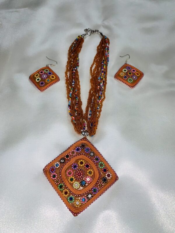 Make a bold statement with this burnt orange African seed bead necklace and earring set. Designed with layered amber-orange seed bead strands and a large diamond-shaped floral pendant, this handmade beaded jewelry set blends vibrant color with intricate craftsmanship.