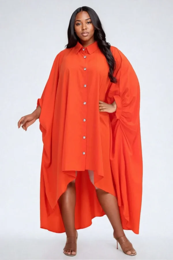 Command the room with the Fire Glow Cascade Button Kaftan Dress, a rich, burnt orange showstopper made for Queens who radiate power and warmth. With its voluminous silhouette, sleek front buttons, and hi-lo hem, this kaftan is elegance in motion — no effort required.