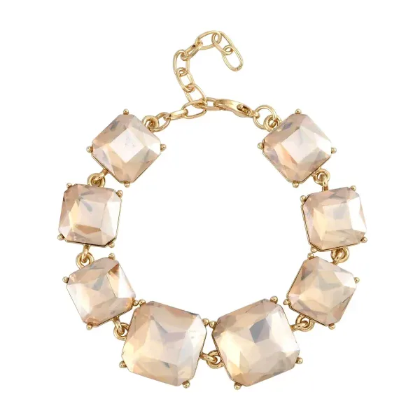 The Champagne Dream Bracelet features eight oversized faceted champagne glass stones set in polished goldtone brass. Designed to reflect light with every movement, this luminous statement piece brings warm sophistication to both formal and everyday styling.