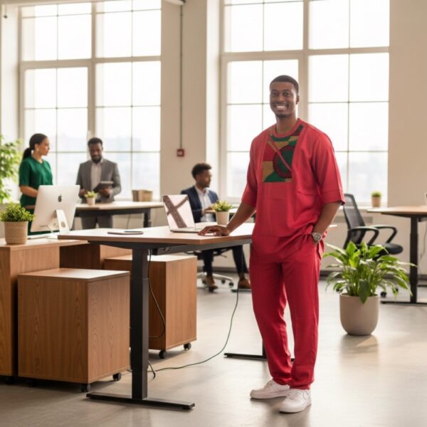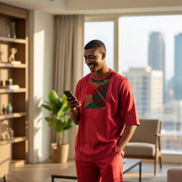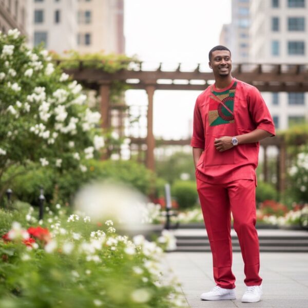 Step into confidence with this one-of-a-kind African Senator Suit, handcrafted in Nigeria using premium fabric and authentic design techniques. This bold crimson set is elevated with a rich Ankara panel detail, blending tradition with modern sophistication.