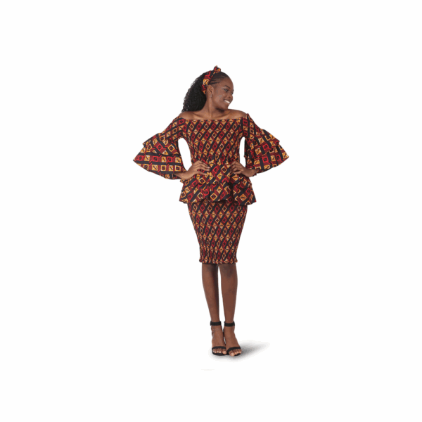 Elevate your wardrobe with our Burgundy Geometric Frill Skirt Set, a striking African print two-piece designed for women who love bold fashion with cultural flair. This elegant set features a fitted, knee-length pencil skirt paired with a matching off-shoulder peplum top. The top showcases layered frill sleeves and a flattering silhouette that blends femininity with traditional style.