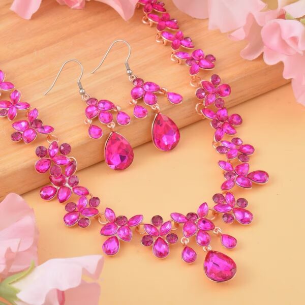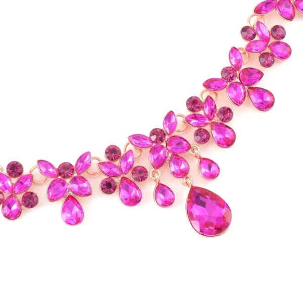 Make a bold entrance with this fuchsia Austrian crystal floral necklace and earrings set. Designed with layered floral motifs and vibrant pink crystals, this set delivers dramatic sparkle and feminine elegance.