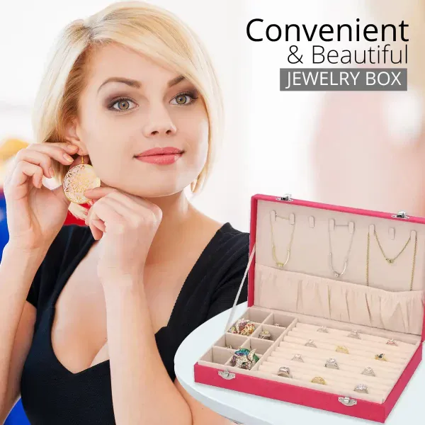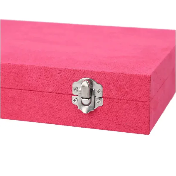 Organize your jewelry collection with this fuchsia velvet jewelry box featuring anti-tarnish lining and a secure lock closure. Designed for dresser or vanity use, this spacious jewelry organizer keeps your pieces protected and neatly arranged.