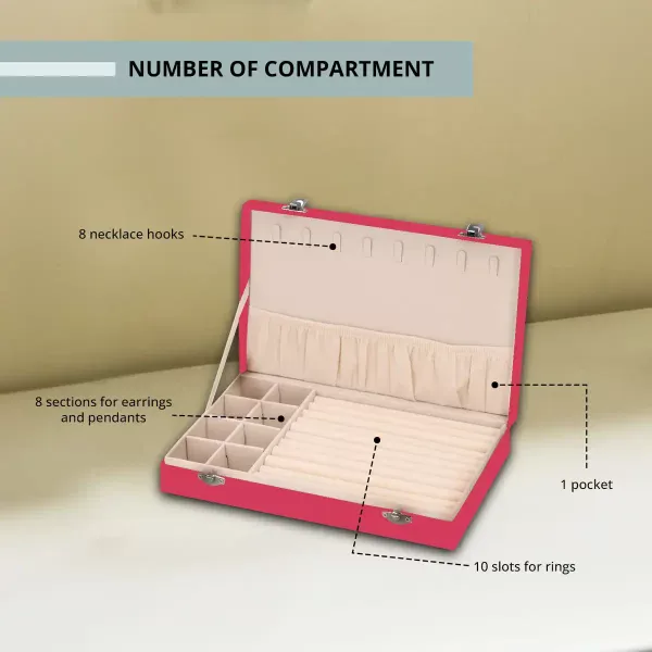 • Storage: 8 necklace hooks, 8 compartments, 10 ring slots