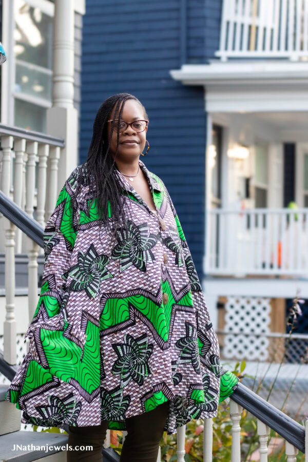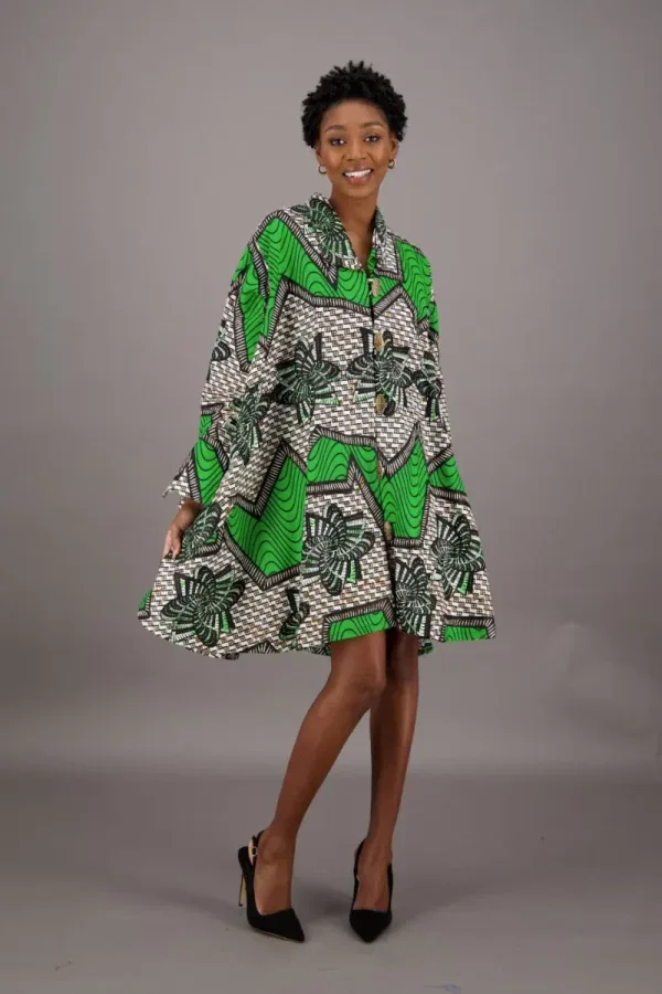 Make a bold entrance in our Emerald Echo Button-Down Dress, where comfort meets statement style. Crafted with a vibrant African print in stunning green tones, this dress is designed to flatter fuller figures with a breezy silhouette and structured shape.