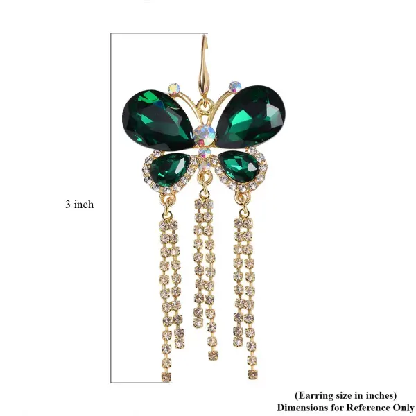 Make a bold, whimsical statement with these Emerald Radiance Butterfly Earrings. Featuring luminous green color glass wings accented with Austrian crystals, this 3.5-inch cascading design brings movement and vibrant sparkle to any look.